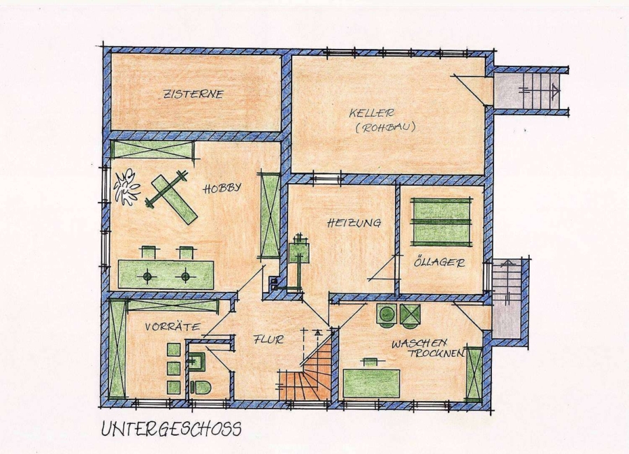 Im Souterrain befinden sich zwei große Zimmer (1 x mit Küchenanschlüssen) mit Tageslichtfenstern, eine zusätzliche Toilette (erweiterungsfähig zum Bad) hell