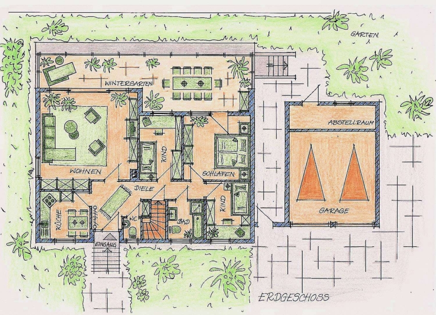 Das fast 40 m² große Wohnzimmer wurde durch den Anbau eines Wintergartens in der Größe fast verdoppelt und ist somit lichtdurchflutet.