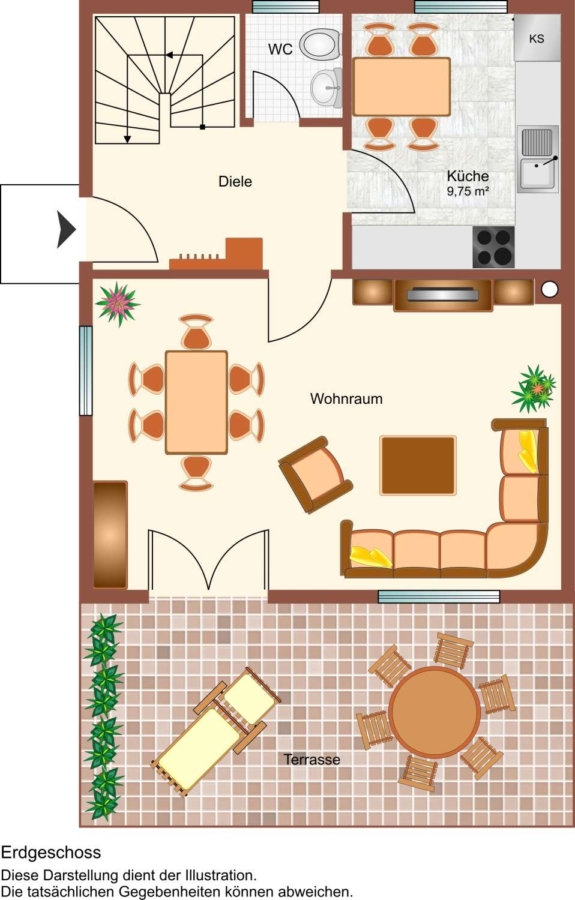 dem Windfang ein Gäste-WC, Küche(Einbauküche) sowie den großzügigen Wohn,-Essbereich mit direktem Zugang auf die Terrasse und in den Garten.