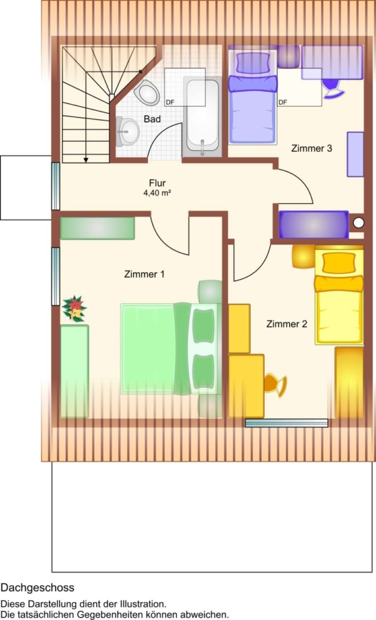Im Obergeschoss verfügen Sie über drei Schlafzimmer und ein Bad.