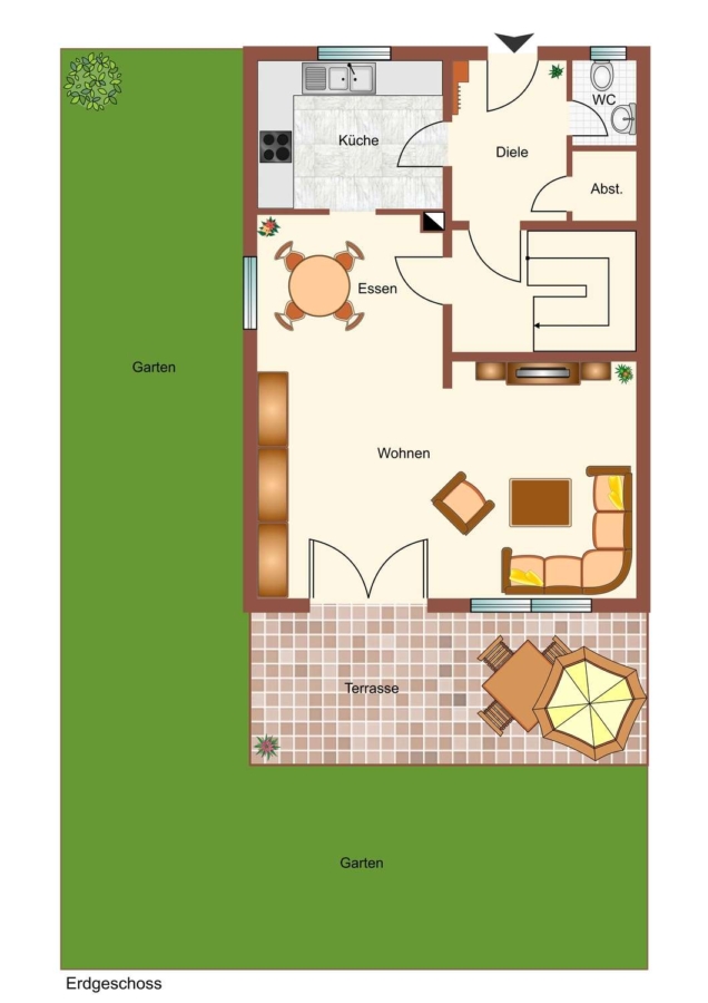 Das Haus bietet Ihnen im Erdgeschoss neben dem Windfang und Diele ein Gäste-WC, Abstellraum die helle moderne Einbauküche sowie einen großzügigen Wohn,-Essbereich