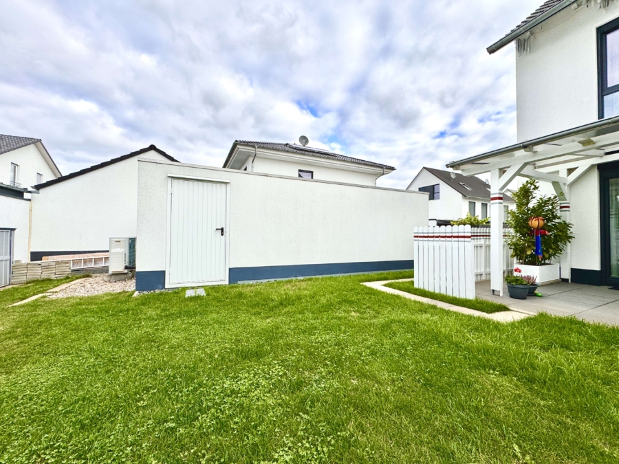 Der großzügigen Wohn-, und Essbereich bildet das Herzstück des Hauses. Große Fensterfronten öffnen den Blick in den Garten und sorgen für eine lichtdurchflutete Wohnatmosphäre. Von hier aus gelangen Sie auf die überdachte Terrasse, ideal für gemütliche Sommerabende oder entspannte Stunden im Freien. Der pflegeleicht angelegte Garten rundet das Gesamtbild optimal ab.