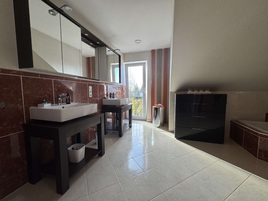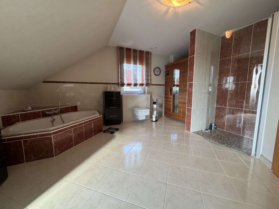Im Obergeschoss verfügen Sie neben der Wohndiele, dem Elternschlafzimmer und zwei weiteren Zimmern (Kind, Büro, Gast etc.) über ein riesiges Wohlfühlbad. Es ist lichtdurchflutet und bietet ebenfalls bodentiefe Fenster. Ein weiteres highlight ist hier die integrierte Biosauna!!
