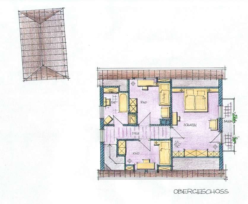 Im Obergeschoß befinden sich drei Schlafzimmer, großer Balkon und das neu gestaltete Bad.