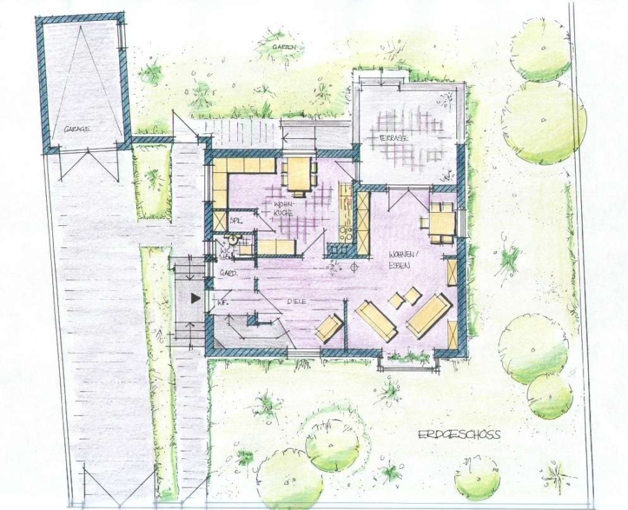 Das Erdgeschoß bietet neben dem Windfang, Gäste-WC und Diele einen großzügigen Wohn,-Essbereich, große helle Wohnküche sowie die schöne Terrasse mit Zugang zu dem herrlichen Garten.