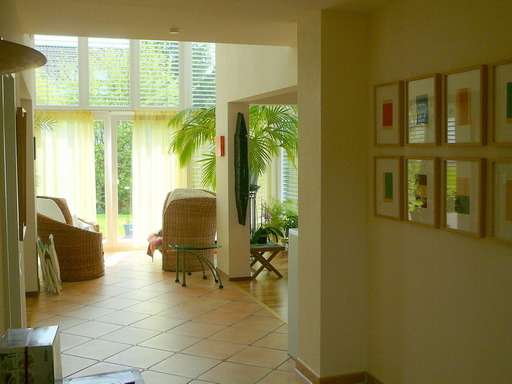 Der Wohn,-Essbereich wie auch die Diele sind mit Holzparkett (Nussbaum) ausgelegt, Durchgang und Wintergarten verfügen über modernen Fliesenbelag.