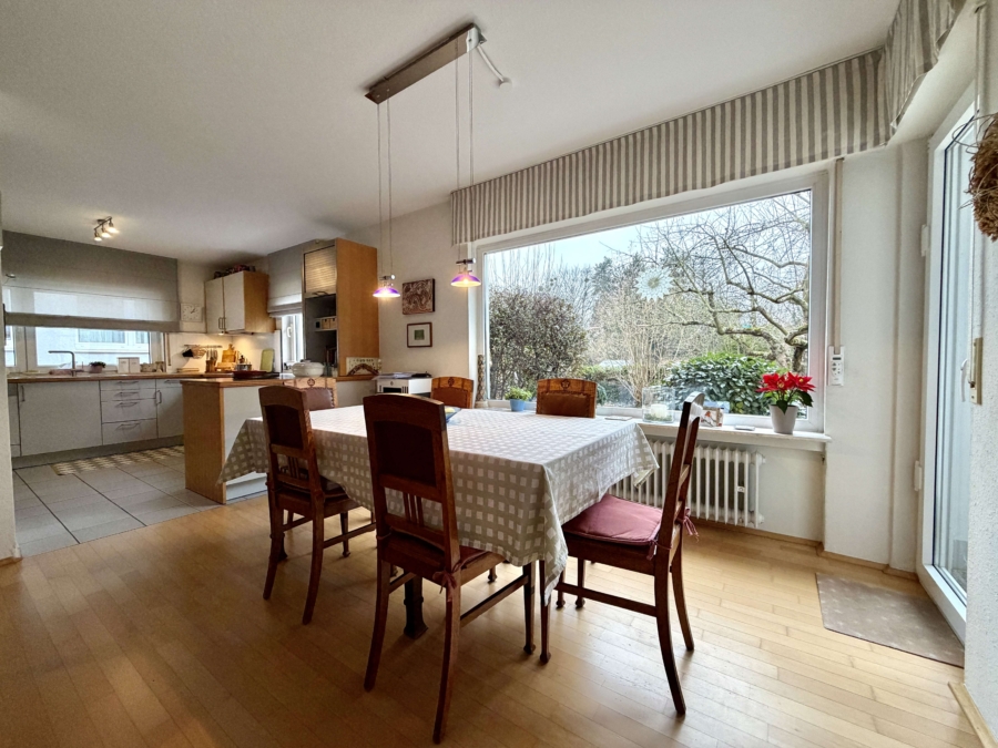 Bereits beim Betreten des Hauses empfängt Sie ein großzügiger Dielenbereich, der einladend wirkt und viel Raum für Garderobe und Ankommen bietet. Zur linken Seite öffnet sich die offene Küche mit angrenzendem Esszimmer, von dem aus sich ein herrlicher Blick in den Garten eröffnet. Ein Ort, an dem gemeinsame Mahlzeiten und gesellige Stunden besonders viel Freude bereiten. Von hier aus gelangt man weiter in das große lichtdurchflutete Wohnzimmer, das mit seinem direkten Zugang zur Terrasse und dem freien Blick in die Natur das Herzstück des Hauses bildet und eine außergewöhnliche Wohnatmosphäre schafft.