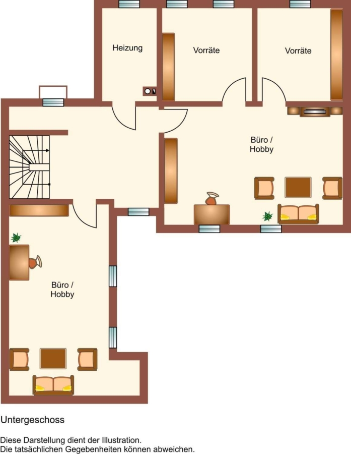Im Untergeschoss (Massivbauweise) befinden sich zwei große Hobbybereiche, welche durchaus zu Wohnzwecken,- und/oder Büro dienen können.