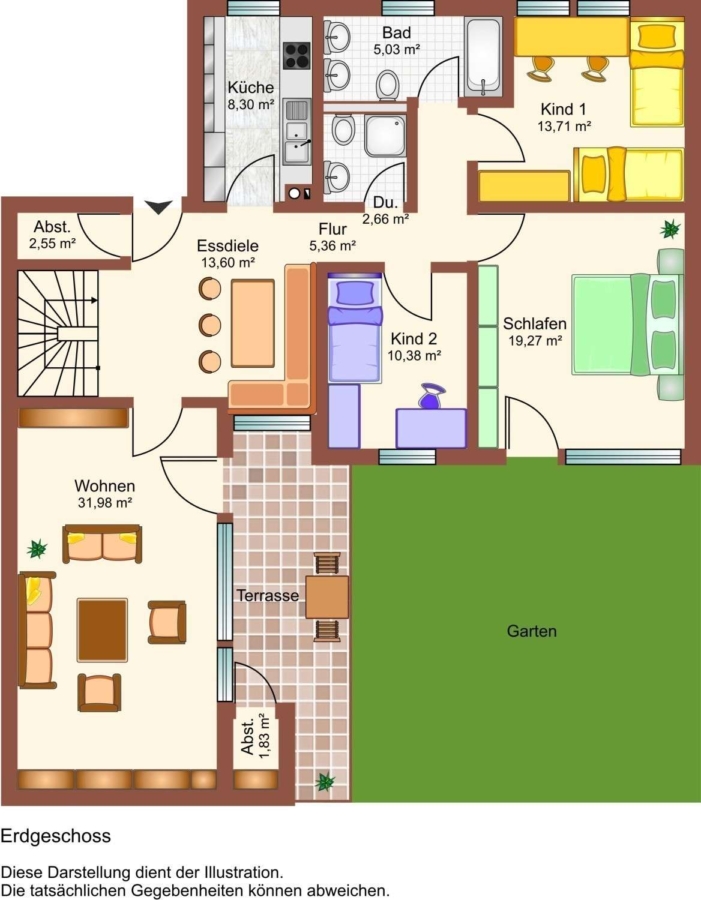 und bietet im Erdgeschoss eine großzügige Wohndiele mit Essbereich, die Küche,