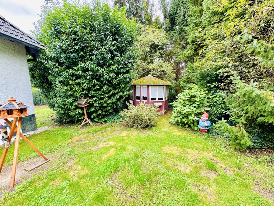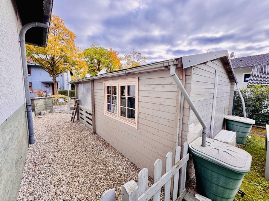 Das große Gartenhaus, ein Holzschuppen sowie ein zusätzlicher Geräteraum bieten reichlich Platz für Gartengeräte, Werkzeuge und Freizeitutensilien. Der Garten lädt zum Entspannen und Verweilen ein, sichtgeschützt und pflegeleicht angelegt.