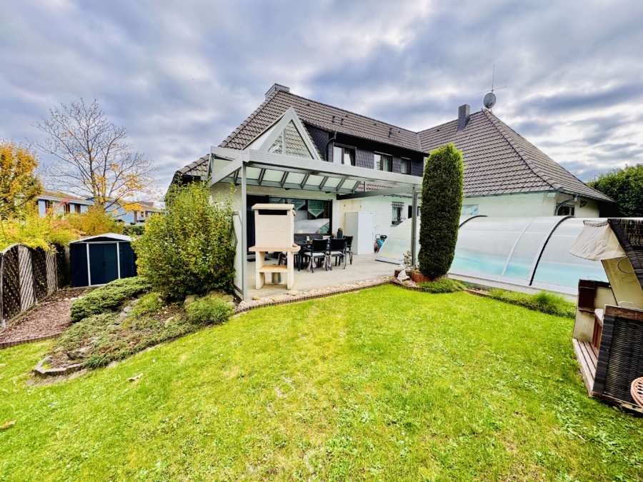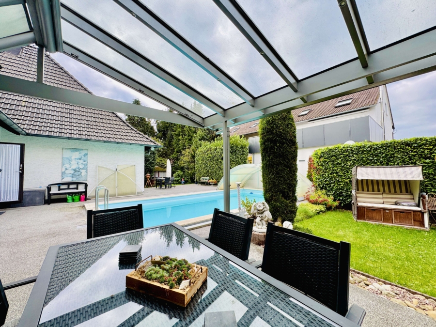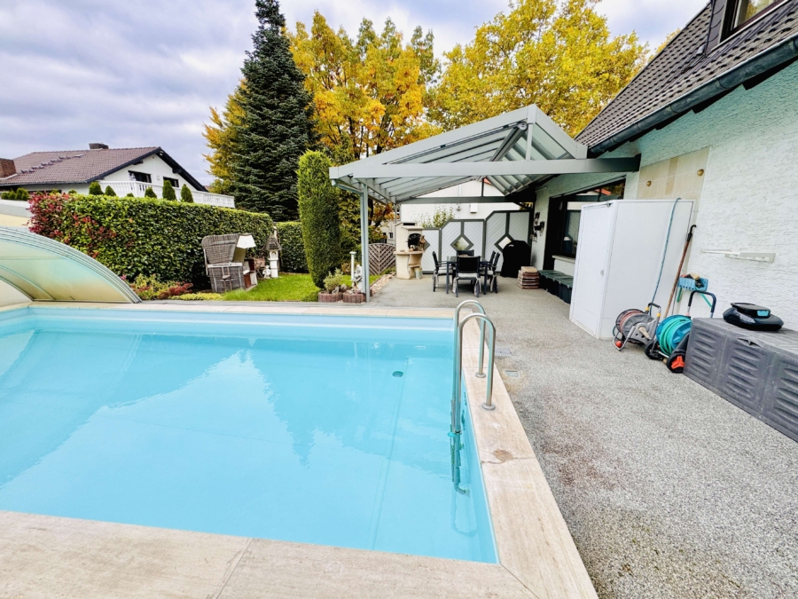Das Grundstück ist liebevoll gestaltet und bietet mit seinem überdachten und beheizbaren Außenpool ein echtes Highlight. Der Pool ist mit einer Schiebehalle ausgestattet, die sich