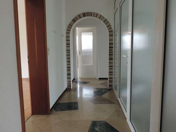 Über den Hausflur gelangen Sie in die Wohndiele, rechter Hand befindet sich das Gäste-WC und der Flur als Zugang zum Büro bzw. auch in die Küche. Der zweite Kücheneingang führt Sie in den großzügigen Wohn,-Essbereich, von hier auf den Balkon(Loggia)und im Erdgeschoss auf die Terrasse und in den Garten.